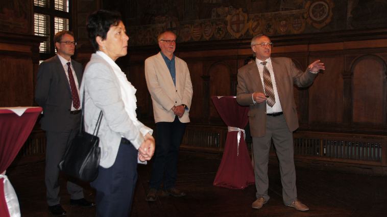 На фото: В историческом зале Совета города 15-го века в Ратуше города Мюльхаузена (Тюрингия). Справа-налево: президент Академии исторических наук Шоль Евгений Иванович (во время доклада), руководитель экспертного отдела городской администрации и Общества охраны исторических памятников города Мюльхаузена Рольф Шадеберг ,переводчица Асия Шэфер и обербургомистр города Мюльхаузена доктор Иоханес Брунс.