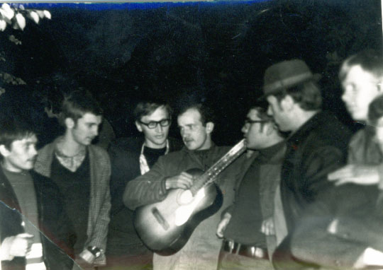 Назад Далее 01-10-1977. Фото №0. Театр. На фото - Театральные кассы брали "ночным стоянием", если надо и "штурмом" раз в две недели. Слева - Татаринов Алевандр, Гнездилов Владимир, я, Фирсов Анатолий (с гитарой), Коломин Василий и Першин Иван (в шляпе) | ||