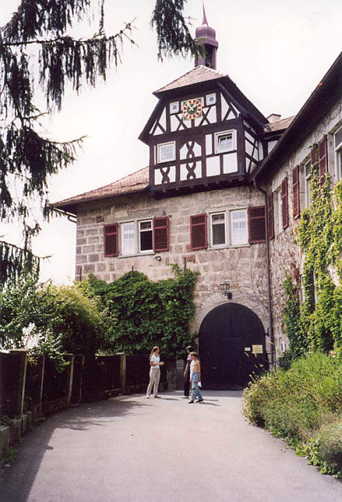 Назад Далее 12-08-2001. Фото №0. Деревня Reichenberg у города Oppenweiler в 40 километрах северо-восточнее города Stuttgart На фото - Ворота замка Reichenberg обычно закрыты - там сейчас размещена социальная служба. Сестра Людмила, сын Роман и Наталия их осматривают, а я фотографирую. | ||