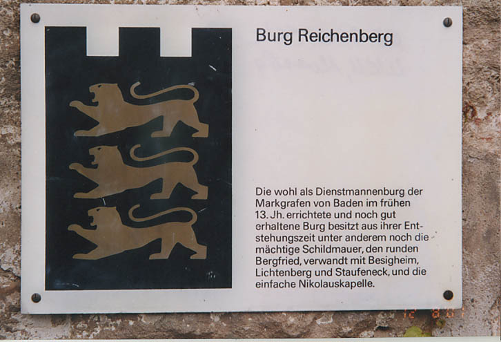 Назад Далее 12-08-2001. Фото №0. Деревня Reichenberg у города Oppenweiler в 40 километрах северо-восточнее города Stuttgart На фото - Вывеска перед воротами крепости Reichenberg, в деревне у которой проживал кузнец Шоль, уехавший в Россию в 1817 году. | ||