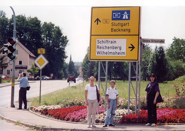 Назад Далее 12-08-2001. Фото №0. Деревня Reichenberg у города Oppenweiler в 40 километрах северо-восточнее города Stuttgart На фото - Въезд на холм с крепостью и деревней Reichenberg - исторической родины семьи Шоль, перехавшей в Россию в 1817 году. Брат Павел (с телекамерой), сестра Людмила, сын Роман, моя Наталия и я (фотографирую их) перед подъемом к еще сохранившемуся дому предков | ||