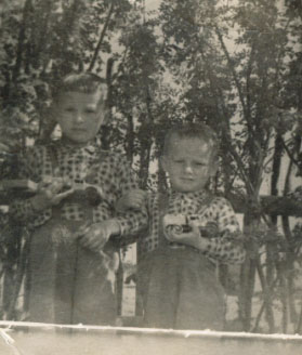Назад Далее 12-08-1960. Фото №0. В селе Чкалово Кокчетавской области. На фото - Я и брат Павел (справа) у незабываемого плетня и высоких акаций огорода у "землянки-мазанки" бабушки Винцентины Филипповны Ратушинской с незабываемыми подарками от дяди Станислава Антоновича Ратушинского. | ||