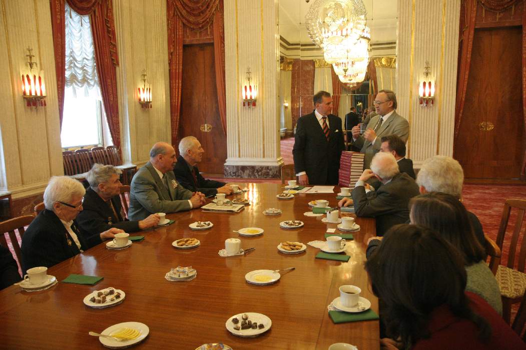 Назад Далее 20-04-2010. Фото №0. Встреча с Чрезвычайным и Полномочным Послом России В.В. Котеневым. Мероприятия в Берлине делегации российских ветеранских организаций по линии научного учреждения "Академия исторических наук" (20-25 апреля 2010 года). Празднование 65-летия Победы советского народа во Второй мировой войне. На фото - Посол России в Германии Котенев Владимир Владимирович (слева) слушает сообщение Президента Академии исторических наук Шоль Евгения Ивановича (справа) о многотомном издании мемуаров "От солдата до генерала. Воспоминания о войне" Академии исторических наук. | ||