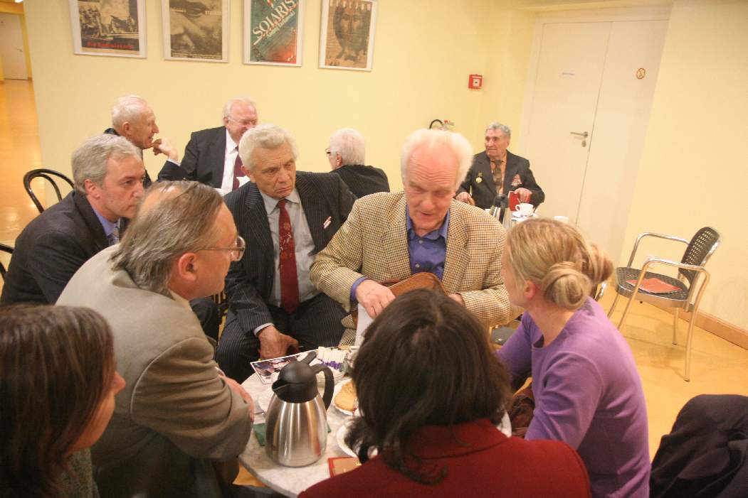 Назад Далее 21-04-2010. Фото №0. Пресс-конференция делегации и вручение Германо-Российскому музею Берлин-Карлсхорст. Мероприятия в Берлине делегации российских ветеранских организаций по линии научного учреждения "Академия исторических наук" (20-25 апреля 2010 года). Празднование 65-летия Победы советского народа во Второй мировой войне. На фото - Члены делегации беседуют с очевидцем взятия Рейхстага профессором Ernst Bittcher (в светлом пиджаке). Слева-направо: в первом ряду действительный член Академии исторических наук Федулова Татьяна Михайловна, Президент Академии исторических наук Шоль Евгений Иванович, Исполнительный секретарь Академии исторических наук Лидяева Наталия Игоревна, переводчик Bögel Ludmila; во втором ряду - Головушкин Вадим Игоревич и Епихин Виталий Иванович. | ||