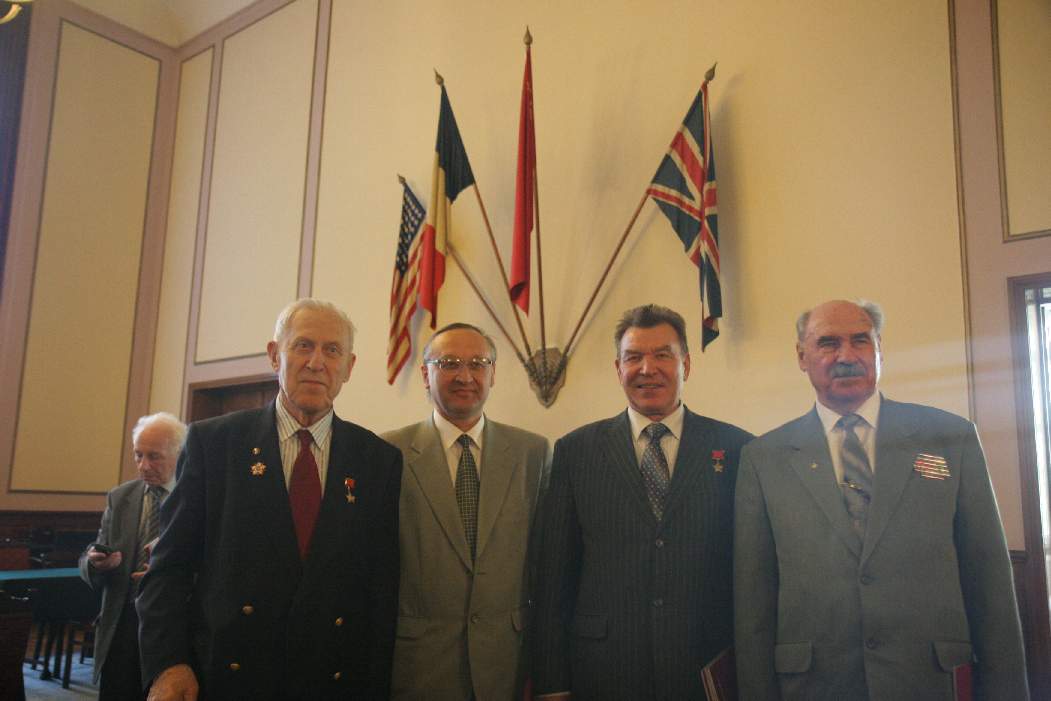 На фото - В зале капитуляции. Фото на память - руководители делегации - Герой Советского Союза Рунов Борис Александрович, Президент Академии исторических наук Шоль Евгений Иванович, Председатель Клуба героев Советского Союза и Российской Федерации Антошкин Николай Тимофеевич, Председатель Всероссийской ветеранской организации Карабанов Дмитрий Иванович. За ними - Директор Межвузовского центра по историческому образованию в технических вузах Порохня Виктор Сидорович.