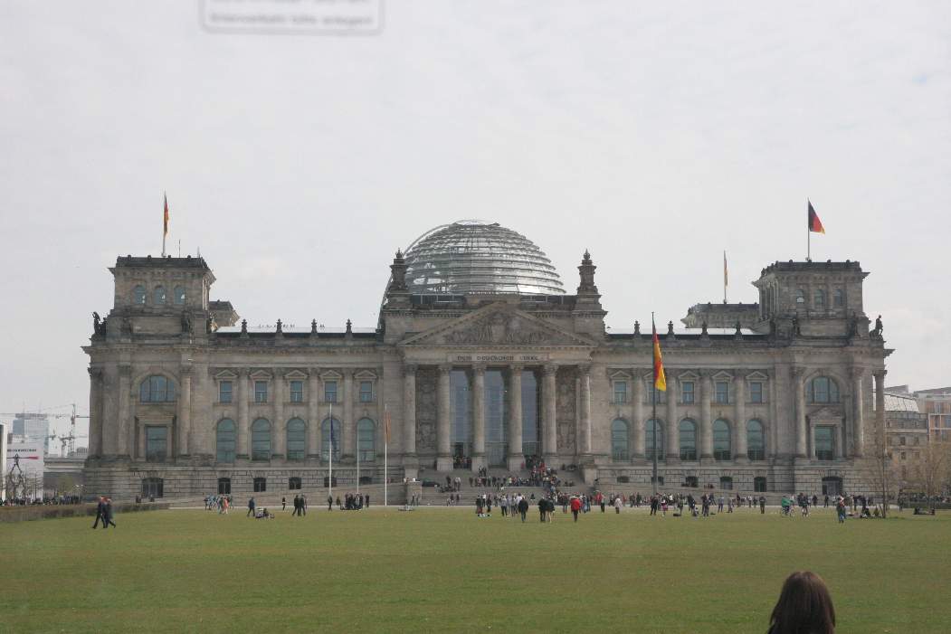 Назад Далее 24-04-2010. Фото №7200. Экскурсия по Берлину. Мероприятия в Берлине делегации российских ветеранских организаций по линии научного учреждения "Академия исторических наук" (20-25 апреля 2010 года). Празднование 65-летия Победы советского народа во Второй мировой войне. На фото - Бундестаг (ранее - Рейхстаг), на полках библиотеки которого теперь имеется комплект из 13-ти томов мемуаров фронтовиков "От солдата до генерала. Воспоминания о войне" | ||