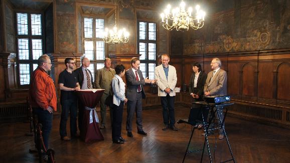 Назад Далее 22-05-2015. Фото №9010. Торжественное открытие 22 мая 2015 года в историческом центре города Мюльхаузена мемориальной доски Лаврентию Блюментросту Старшему - главе династии врачей Блюментростов, ставших в 17-18 веках основателями театральной культуры, музейного дела, инновационного развития и науки России. На фото - 010-142-386 В историческом зале Совета города 15-го века в Ратуше города Мюльхаузена (Тюрингия). Справа-налево: президент Академии исторических наук Шоль Евгений Иванович, заместитель президента Академии исторических наук Лидяева Наталия Игоревна, руководитель экспертного отдела городской администрации и Общества охраны исторических памятников города Мюльхаузена Рольф Шадеберг, обербургомистр города Мюльхаузена доктор Иоханес Брунс (объявляет начало мероприятия), переводчица Асия Шэфер, Франк Мёллер (1-й слева) и представители общественности города. | ||