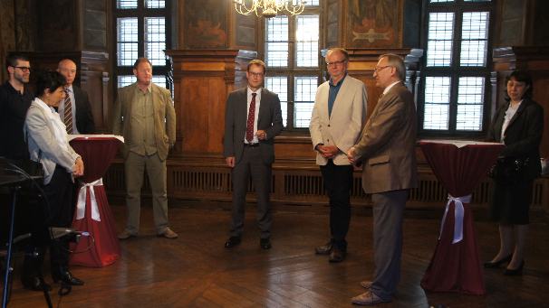 Назад Далее 22-05-2015. Фото №9050. Торжественное открытие 22 мая 2015 года в историческом центре города Мюльхаузена мемориальной доски Лаврентию Блюментросту Старшему - главе династии врачей Блюментростов, ставших в 17-18 веках основателями театральной культуры, музейного дела, инновационного развития и науки России. На фото - 050-146-390 В историческом зале Совета города 15-го века в Ратуше города Мюльхаузена (Тюрингия). Справа-налево: заместитель Академии исторических наук Лидяева Наталия Игоревна, президент Академии исторических наук Шоль Евгений Иванович (отвечает на вопросы), руководитель экспертного отдела городской администрации и Общества охраны исторических памятников города Мюльхаузена Рольф Шадеберг, обербургомистр города Мюльхаузена доктор Иоханес Брунс, переводчица Асия Шэфер (2-я слева) и представители общественности города. | ||