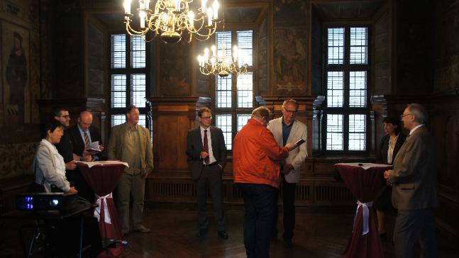 Назад Далее 22-05-2015. Фото №9060. Торжественное открытие 22 мая 2015 года в историческом центре города Мюльхаузена мемориальной доски Лаврентию Блюментросту Старшему - главе династии врачей Блюментростов, ставших в 17-18 веках основателями театральной культуры, музейного дела, инновационного развития и науки России. На фото - 060-147-391 В историческом зале Совета города 15-го века в Ратуше города Мюльхаузена (Тюрингия). Франк Мёллер (4-й справа)вручает руководителю экспертного отдела городской администрации и Общества охраны исторических памятников города Мюльхаузена Рольфу Шадебергу (3-й справа)книгу "Сборник трудов №2 Международной научно-исторической конференции имени академика Л. Блюментроста" с его статьей "Династия врачей Блюметростов в России".
