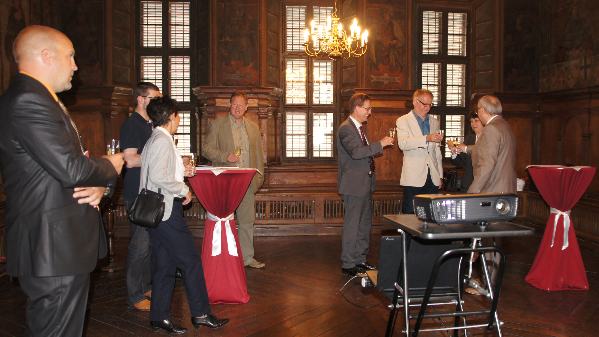Назад Далее 22-05-2015. Фото №9120. Торжественное открытие 22 мая 2015 года в историческом центре города Мюльхаузена мемориальной доски Лаврентию Блюментросту Старшему - главе династии врачей Блюментростов, ставших в 17-18 веках основателями театральной культуры, музейного дела, инновационного развития и науки России. На фото - 120-150-394 В историческом зале Совета города 15-го века в Ратуше города Мюльхаузена (Тюрингия). Поздравительный тост в честь памяти великого врача и руководителя средневекового города Мюльхаузена и науки России Лаврентия Блюментроста Старшего.