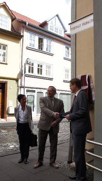 Назад Далее 22-05-2015. Фото №9160. Торжественное открытие 22 мая 2015 года мемориальной доски Лаврентию Блюментросту Старшему - главе династии врачей Блюментростов, ставших в 17-18 веках основателями театральной культуры, музейного дела, инновационного развития и науки России. На фото - 160-154-398 У дома №5 на улице Рёблинга в историческом центре города Мюльхаузена 15-го века (Тюрингия). Обербургомистр города Мюльхаузена доктор Иоханес Брунс (справа) и президент Академии исторических наук Шоль Евгений Иванович (в центре) вручают друг другу ножницы. Слева - переводчица Асия Шэфер. На стене задрапированная мемориальная доска и лента с текстом "Блюментрост Л.А (1619-1705)", оформленная германским и российскими триколорами. | ||