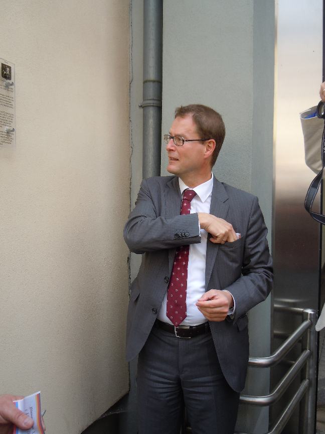 Назад Далее 22-05-2015. Фото №9210. Торжественное открытие 22 мая 2015 года мемориальной доски Лаврентию Блюментросту Старшему - главе династии врачей Блюментростов, ставших в 17-18 веках основателями театральной культуры, музейного дела, инновационного развития и науки России. На фото - 210-160-404 У дома №5 на улице Рёблинга в историческом центре города Мюльхаузена 15-го века (Тюрингия). Обербургомистр города Мюльхаузена доктор Иоханес Брунс берет на память первый фрагмент ленты с текстом "Блюментрост Л.А (1619-1705)", оформленной германским и российскими триколорами. | ||