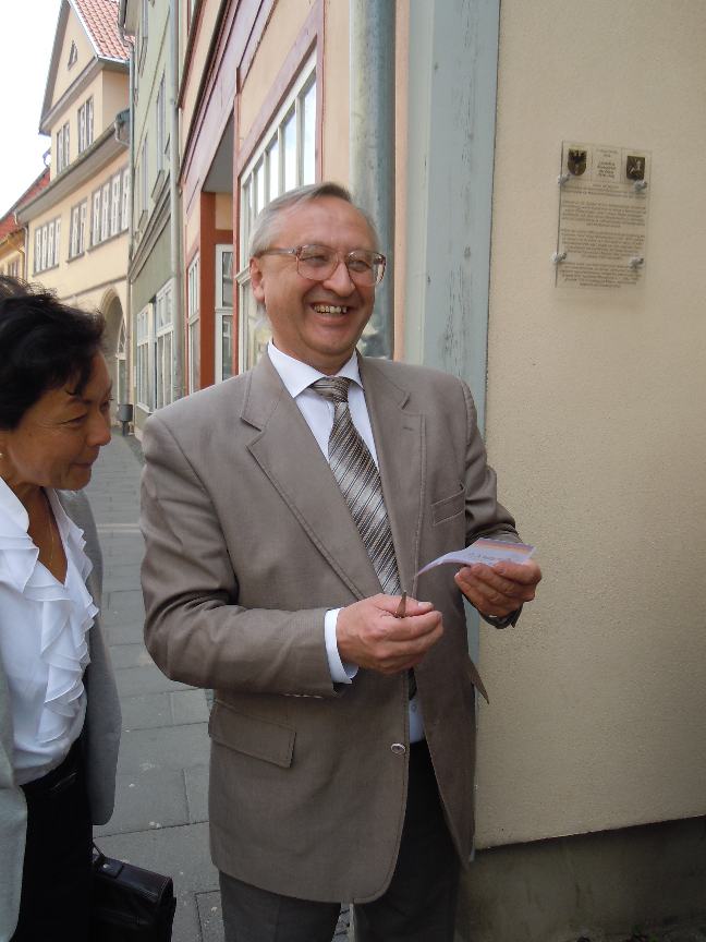 Назад Далее 22-05-2015. Фото №9220. Торжественное открытие 22 мая 2015 года мемориальной доски Лаврентию Блюментросту Старшему - главе династии врачей Блюментростов, ставших в 17-18 веках основателями театральной культуры, музейного дела, инновационного развития и науки России. На фото - 220-161-405 У дома №5 на улице Рёблинга в историческом центре города Мюльхаузена 15-го века (Тюрингия). Президент Академии исторических наук Шоль Евгений Иванович берет на память второй фрагмент ленты с текстом "Блюментрост Л.А (1619-1705)", оформленной германским и российскими триколорами. Слева - переводчица Асия Шэфер. | ||