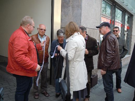 Назад Далее 22-05-2015. Фото №9280. Торжественное открытие 22 мая 2015 года мемориальной доски Лаврентию Блюментросту Старшему - главе династии врачей Блюментростов, ставших в 17-18 веках основателями театральной культуры, музейного дела, инновационного развития и науки России. На фото - 280-164-408 У дома №5 на улице Рёблинга в историческом центре города Мюльхаузена 15-го века (Тюрингия). Франк Мёллер (1-й слева)отрезает и раздает на память фрагменты лены участникам открытия мемориальной доски. Руководитель архивной службы города (4-я слева), корреспондент газеты "Тюрингия Альгемайне" (2-й справа) и представители общественности города. | ||