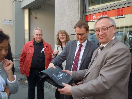 Назад Далее 22-05-2015. Фото №9320. Торжественное открытие 22 мая 2015 года мемориальной доски Лаврентию Блюментросту Старшему - главе династии врачей Блюментростов, ставших в 17-18 веках основателями театральной культуры, музейного дела, инновационного развития и науки России. На фото - 320-168-412 У дома №5 на улице Рёблинга в историческом центре города Мюльхаузена 15-го века (Тюрингия). Президент Академии исторических наук Шоль Евгений Иванович (справа) принимает от обербургомистра города Мюльхаузена доктора Иоханеса Брунса (2-й справа) подарочную сумку города Мюльхаузена с пятью экземплярами-копиями мемориальной, доски посвященной Лаврентию Блюментросту Старшему, для музеев города Москвы. Слева-направо: переводчица Асия Шэфер, Франк Мёллер и руководитель архивной службы города. | ||