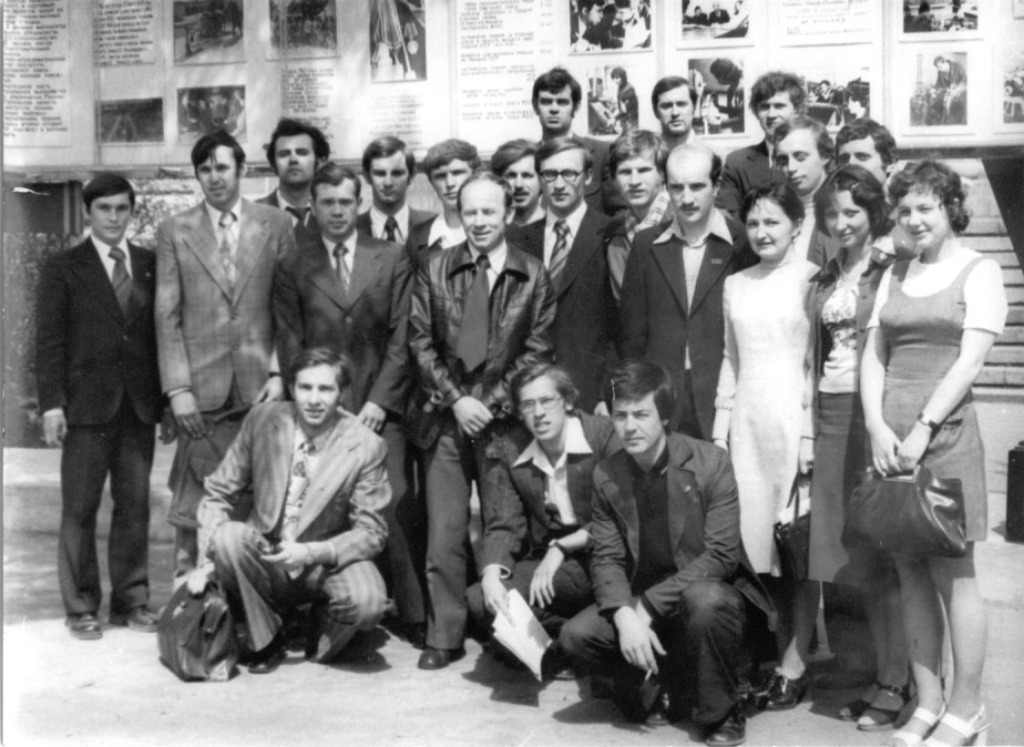 На фото - 102-я группа факультета летательных аппаратов МАИ у стенда на Волоколамке после защиты диплома