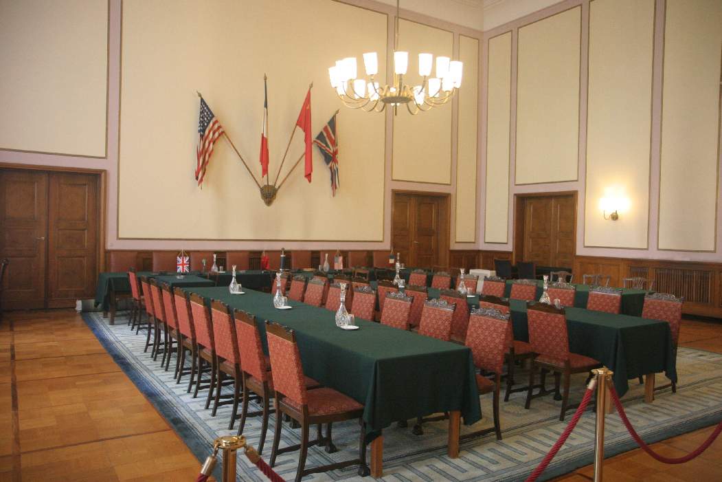 Назад Далее 21-04-2010. Фото №0. Пресс-конференция делегации и вручение Германо-Российскому музею Берлин-Карлсхорст. Мероприятия в Берлине делегации российских ветеранских организаций по линии научного учреждения "Академия исторических наук" (20-25 апреля 2010 года). Празднование 65-летия Победы советского народа во Второй мировой войне. На фото - Зал подписания капитуляции. | ||