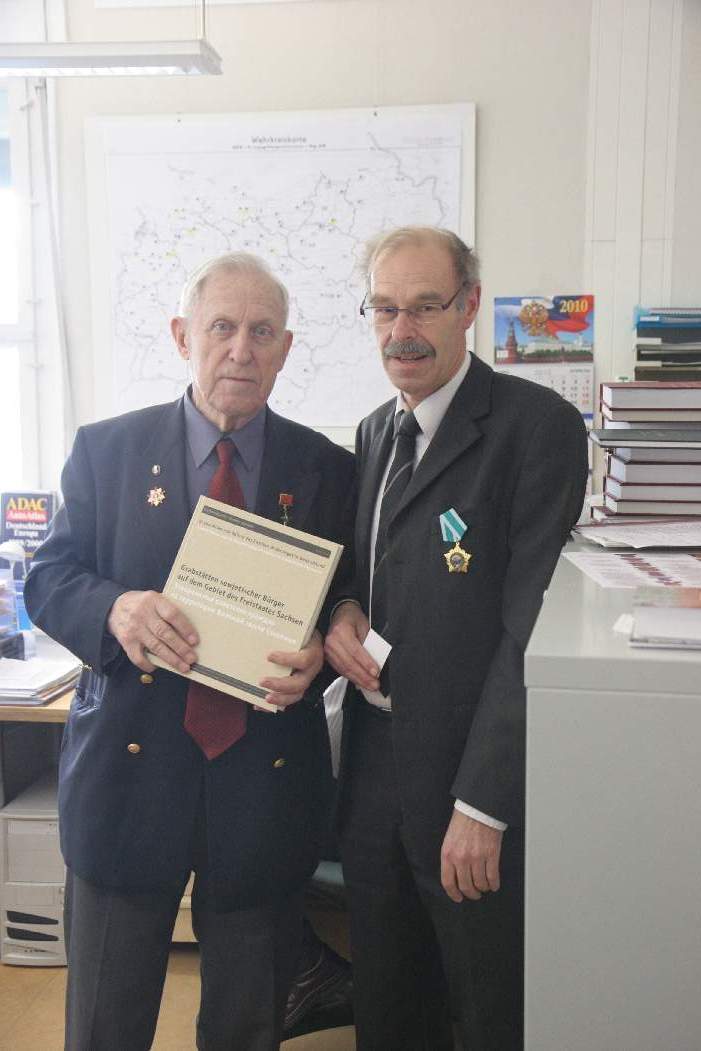 На фото - Руководитель Клаус-Дитер Мюллер дарит делегации и Рунову Борису Александровичу 1-й том книги памяти "Захоронения советских грждан на территории Вольной земли Саксония" (Дрезден, 2008) и 2-х томника "Цейтхайн - Книга Памяти советских военнопленных" (Дрезден, 2005: Т.1. Лагерь военнопленнных Цейтхайн - от "лагеря русских" к мемориалу; Т.2. Именная книга умерших советских военнопленных)