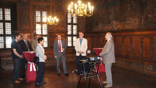 Назад Далее 22-05-2015. Фото №9020. Торжественное открытие 22 мая 2015 года в историческом центре города Мюльхаузена мемориальной доски Лаврентию Блюментросту Старшему - главе династии врачей Блюментростов, ставших в 17-18 веках основателями театральной культуры, музейного дела, инновационного развития и науки России. На фото - 020-143-387 В историческом зале Совета города 15-го века в Ратуше города Мюльхаузена (Тюрингия). Справа-налево: президент Академии исторических наук Шоль Евгений Иванович (выступает с докладом), руководитель экспертного отдела городской администрации и Общества охраны исторических памятников города Мюльхаузена Рольф Шадеберг, обербургомистр города Мюльхаузена доктор Иоханес Брунс, переводчица Асия Шэфер и представители общественности города. | ||