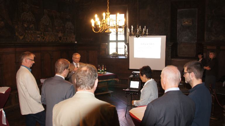 Назад Далее 22-05-2015. Фото №9030. Торжественное открытие 22 мая 2015 года в историческом центре города Мюльхаузена мемориальной доски Лаврентию Блюментросту Старшему - главе династии врачей Блюментростов, ставших в 17-18 веках основателями театральной культуры, музейного дела, инновационного развития и науки России. На фото - 030-144-388 В историческом зале Совета города 15-го века в Ратуше города Мюльхаузена (Тюрингия). Слева-направо: руководитель экспертного отдела городской администрации и Общества охраны исторических памятников города Мюльхаузена Рольф Шадеберг, обербургомистр города Мюльхаузена доктор Иоханес Брунс, президент Академии исторических наук Шоль Евгений Иванович (делает доклад о Блюментросте), переводчица Асия Шэфер (5-я слева), заместитель президента Академии исторических наук Лидяева Наталия Игоревна (2-я справа), руководитель архивной службы (1-я справа) и представители общественности города. | ||