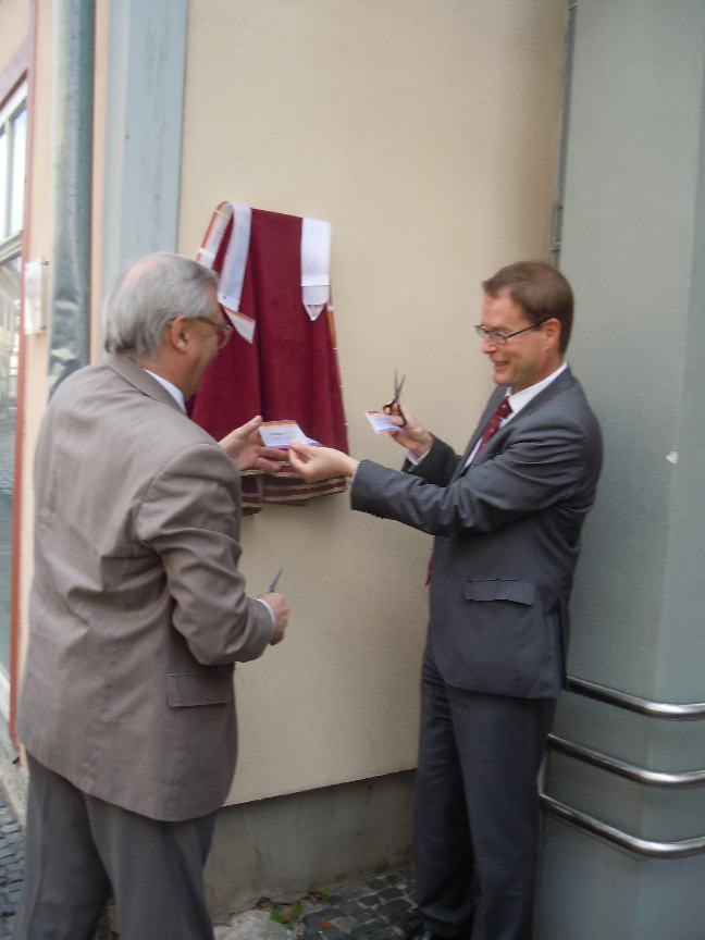 На фото - 171-155-399 У дома №5 на улице Рёблинга в историческом центре города Мюльхаузена 15-го века (Тюрингия). Президент Академии исторических наук Шоль Евгений Иванович (слева) и обербургомистр города Мюльхаузена доктор Иоханес Брунс вручают друг другу фрагменты разрезанной ленты с текстом "Блюментрост Л.А (1619-1705)", оформленной германским и российскими триколорами.