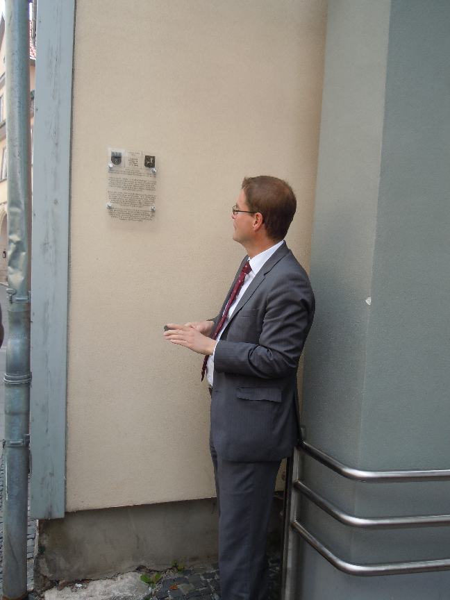 Назад Далее 22-05-2015. Фото №9230. Торжественное открытие 22 мая 2015 года мемориальной доски Лаврентию Блюментросту Старшему - главе династии врачей Блюментростов, ставших в 17-18 веках основателями театральной культуры, музейного дела, инновационного развития и науки России. На фото - 230-162-406 У дома №5 на улице Рёблинга в историческом центре города Мюльхаузена 15-го века (Тюрингия). Обербургомистр города Мюльхаузена доктор Иоханес Брунс читает текст на мемориальной доске посвящённой Лаврентию Блюментросту Старшему - бывшему бургомистру города Мюльхаузена с 1661 по 1667 год. До этого в городе были открыты аналогичные мемориальные доски всемирно известным жителям Мюльхаузена – духовному лидеру социального движения Реформации Томасу Мюнцеру (1490-1525), композитору Иогану Себастьяну Баху (1685-1750 ), а также изобретателю стального каната и строителю Бруклинского моста – Иогану Аугусту Рёблингу (1806-1869) | ||