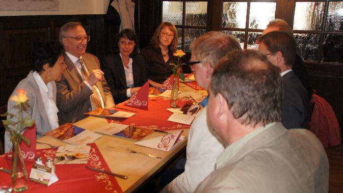 На фото - 341-181-425 Дружеский обед в ресторане у Ратуши города Мюльхаузена. Президент Академии исторических наук Шоль Евгений Иванович (2-й слева) сообщает мероприятиях, планируемых Академией исторических наук в текущем и следующем году в Москве, по увековечению памяти династии врачей Блюментростов. Переводчик Асия Шэфер (1-я слева), заместитель Академии исторических наук Лидяева Наталия Игоревна (3-я слева), руководитель архивной службы города Мюльхаузена (4-я слева). На переднем плане - представитель общественности города, руководитель экспертного отдела городской администрации и Общества охраны исторических памятников города Мюльхаузена Рольф Шадеберг, обербургомистр города Мюльхаузена доктор Иоханес Брунс и Франк Мёллер