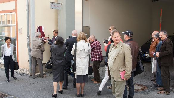 Назад Далее 22-05-2015. Фото №9171. Торжественное открытие 22 мая 2015 года мемориальной доски Лаврентию Блюментросту Старшему - главе династии врачей Блюментростов, ставших в 17-18 веках основателями театральной культуры, музейного дела, инновационного развития и науки России. На фото - 171-156-427 У дома №5 на улице Рёблинга в историческом центре города Мюльхаузена 15-го века (Тюрингия). Обербургомистр города Мюльхаузена доктор Иоханес Брунс (справа) и президент Академии исторических наук Шоль Евгений Иванович (слева) передают друг другу фрагменты разрезанной ленты с текстом "Блюментрост Л.А (1619-1705)", оформленной германским и российскими триколорами. Переводчица Асия Шэфер (слева), заместитель Академии исторических наук Лидяева Наталия Игоревна (4-я слева), руководитель архивной службы города (6-я слева), руководитель экспертного отдела городской администрации и Общества охраны исторических памятников города Мюльхаузена Рольф Шадеберг (8-й слева) и представители общественности города.