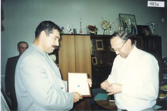 Вода Валерию Захаровичу (слева) вручает Серебряный Знак Факультета Шоль Евгений Иванович (справа). В кабинете декана факультета. Позади Денисов Николай Валерьевич.