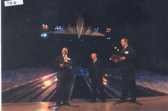 Шубин Валерий Иванович (справа) сообщает о чеке выпускников на один миллион рублей. В центре ректор Матвеенко Александр Макарович и справа ведущий Воробьев Алексей Павлович